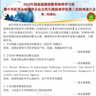 由中华医学会病理学分会女性生殖病理学组和中南大学湘雅医院举办的国家级继续教育病理学习班暨第三次病理读片会【20161801040001】定于2016年5月20日-22日在湖南长沙举行,本次会议以子宫内膜及宫颈腺上皮疾病、宫体间质肿瘤及卵巢性索间质肿瘤诊断为主题,邀请国内外著名病理学家做主题演讲,主题报告为: