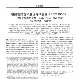 嗜酸性实性和囊性肾细胞癌(eosinophilic solid and cystic renal cell carcinoma,ESC RCC)是新近认识的一种独特类型的惰性肾肿瘤,发生在伴或者不伴有结节性硬化症的女性患者。尽管ESC RCC具有独特的组织学特点且常见CK20表达,但其分子核型特征仅在数例肿瘤中进行了研究。我们从多个医学中心的存档病例中找到了19例ESC RCC,所有患者均为女性且无结节性硬化症的临床表现。13例进行了分子核型分析(12例有结论性的分析结果)。中位年龄55岁(32~79岁)。肿瘤大体上呈实性和囊性外观、切面灰黄、中位大小31mm(12~135mm)。所有肿瘤均显示典型的显微镜下特征,即实性区域混有大小不等的巨囊性和微囊性囊肿。瘤细胞胞质嗜酸性,可见颗粒状的胞浆彩斑,核圆形至卵圆形。19例中有14例(73%)肿瘤表达CK20。19例中有17例(89%)患者病理分期为pT1期(12例为pT1a期,5例为pT1b期);各有1例患者为pT2a期和pT3a期。16例患者有随访信息,随访1到169 个月后(中位:44个月;平均:49.6个月),15例患者生存且无疾病进展证据;3例患者死于其它疾病。最常见的拷贝数获得为16p13.3-16q23.1(33%~67%)、7p21.2-7q36.2(42%~50%)、13q14.2(33%)以及19p12(33%)。最常见的拷贝数丢失包括Xp11.21(42%)以及22q11.23(33%)。杂合性丢失最常见于16p11.2-11.1(75%)、q11.1-13.1(75%)、Xq13.1-21.1(33%)、11p11.2-11.11(33%)、9q21.1-22.2(33%)以及9q33.1(33%)。ESC RCC显示重现性的分子核型异常,进一步支持其独特的属性。