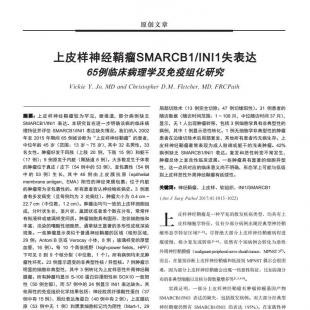 上皮样神经鞘瘤较为罕见,据报道,部分病例缺乏SMARCB1/INI1表达。本研究旨在进一步明确该病的临床病理特征并评估SMARCB1/INI1表达缺失情况。我们纳入2002年至2015年期间65例被诊断为“上皮样神经鞘瘤”的患者,中位年龄45岁(范围:13岁~75岁),其中32名男性,33名女性。肿瘤好发于四肢(上肢20例,下肢15例)和躯干(17 例);9例原发于内脏(胃肠道8例)。大多数发生于体表的肿瘤位于真皮/皮下(54例中的53例),呈包裹性(54例中的53例)生长,其中46例由上皮膜抗原(epithelial membrane antigen,EMA)阳性的神经束膜包裹;位于内脏的肿瘤常为非包裹性的。所有患者否认神经嵴疾病史。3例患者有多发病变(且每例均为2处病灶)。肿瘤大小为0.4cm~22.7cm(中位数,1.2cm)。肿瘤由均匀一致的上皮样细胞组成,分叶状生长,呈片状、巢团状或者单个散在分布,常常伴有粘液样或玻璃样变间质。肿瘤细胞具有圆形、泡状细胞核和丰富、淡染的嗜酸性细胞质,通常缺乏显著的多形性或核深染现象。一些肿瘤显示类似于普通神经鞘瘤的区域(梭形区域,29例;Antoni B区或Verocay小体,8例;玻璃样变的厚壁血管,16例)。每10个高倍视野(high-power fields,HPF)下可见0到9个核分裂(中位数,1个)。所有病例均未见肿瘤性坏死。23例显示退变的非典型性核/异型核。7例肿瘤示明显的细胞非典型性,其中3例转化为上皮样恶性外周神经鞘膜瘤。所有肿瘤均显示S-100蛋白弥漫阳性和SOX10一致阳性(50例全部),而57例中的24例显示INI1表达缺失。其他阳性的免疫组织化学结果包括:神经胶质纤维酸性蛋白(37例中有15例)、局灶表达角蛋白(40例中有2例);上皮膜抗原(53例中无1例)和黑素细胞标记均为阴性(Mart-1,29例中无1例;HMB-45,23例中无1例)。大多数患者接受了局部切除术(13例完全切除;47例切缘阳性)。31例患者的随访数据(随访时间范围:1~108月,中位随访时间37月),显示,无1人出现肿瘤转移,包括3例细胞学具有非典型性的病例,其中1例显示恶性转化。1例无细胞学非典型性的肿瘤患者在边缘切除术后局部复发,其他所有患者均无病生存。上皮样神经鞘瘤最常表现为成人肢端或躯干的浅表肿瘤。42%病例缺乏SMARCB1/INI1表达。复发和恶性转变不常发生,肿瘤总体上呈良性临床进展。一些肿瘤具有显著的细胞异型性,这一点所对应的临床意义尚不明确,形态学上可能与低级别上皮样恶性外周神经鞘瘤有延续性。