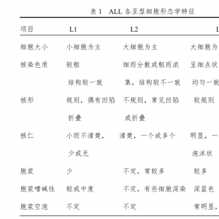 法国、美国、英国(FAB)协作组于1976年用Romanowsky染色观察血片及骨髓涂片,根据细胞大小、核浆比例、核仁大小及数量、细胞浆嗜碱程度等,将ALL分为L1、L2、L3三个亚型(表1)。