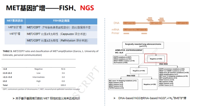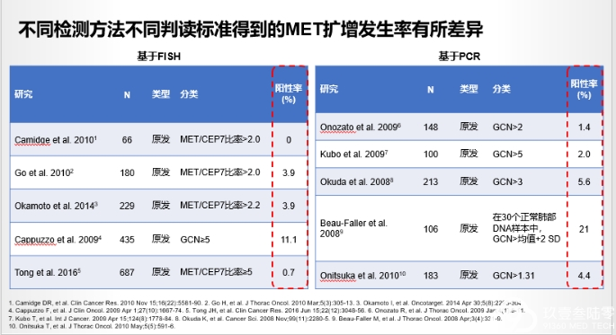没有共识!对于 MET 扩增或蛋白过表达,常用的原位杂交(FISH)法,NGS或免疫组化,结果判定的cut-off值尚未达成统一的共识,不同临床研究采用的截断值标准有待统一;