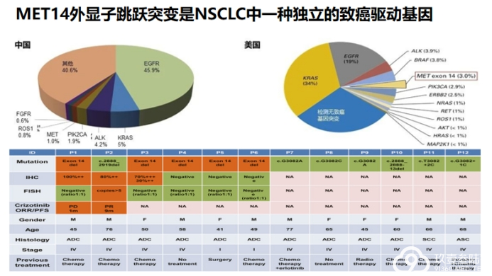 而在中国人群中,Liu等分析了968例中国NSCLC患者的DNA,发现仅有12例患者具有MET 14外显子跳跃突变,占腺癌患者的0.9%,明显低于高加索人群的发病率。