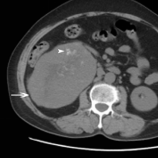 影像学资料:超声和计算机断层扫描显示右肾下极有一个肿块,大小为13.4×15.4×11.4 cm。