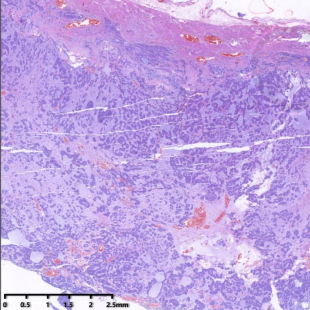 低倍镜,肿瘤具有厚的纤维性包膜及多样的组织学结构,由实性巢状区域、假乳头区域及出血区域组成,间质黏液变性,部分区域囊性变。