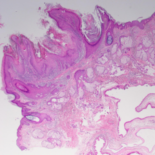 带皮瓣不整形组织一个,体积约1.3cm*1cm*0.8cm,皮瓣面积约1.3cm*1cm,皮瓣表面见一隆起,直径约0.6cm,高出皮面0.4cm,切面灰白色,实性质中。 三、镜下所示 图1表皮乳头瘤样增生伴角化过度,真皮内皮脂腺增生,皮脂腺下方可见多个扩张的囊腔。