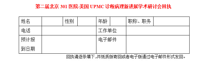 2、回执邮寄至:北京市复兴路28号中国人民解放军总医院病理科,100853;