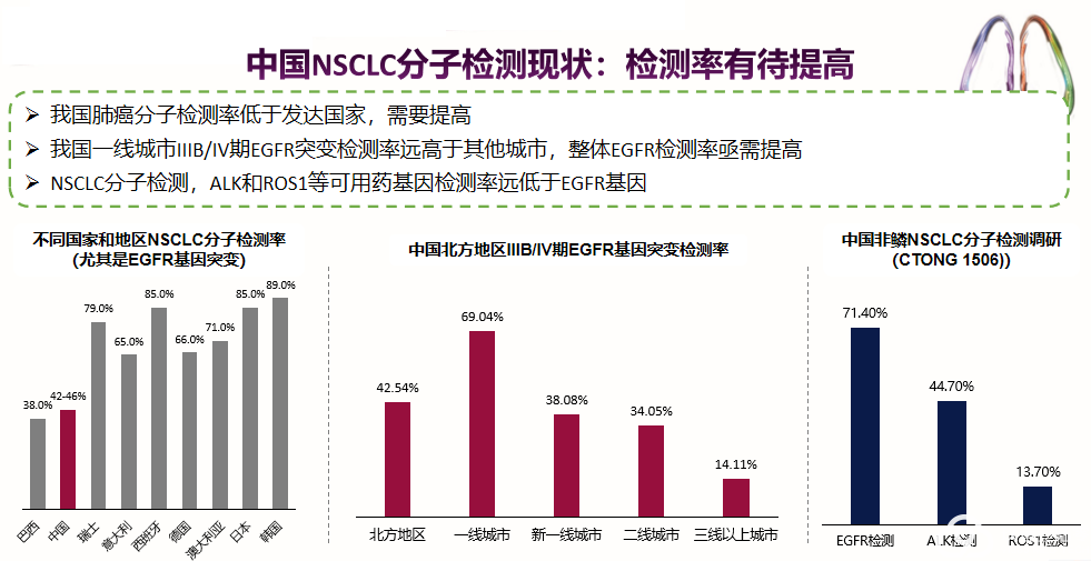 1、分子时代的肿瘤诊断,使肿瘤治疗步入个体化时代,但在我国靶向药物对应的靶向基因的检测率还很低,有待快速提高。