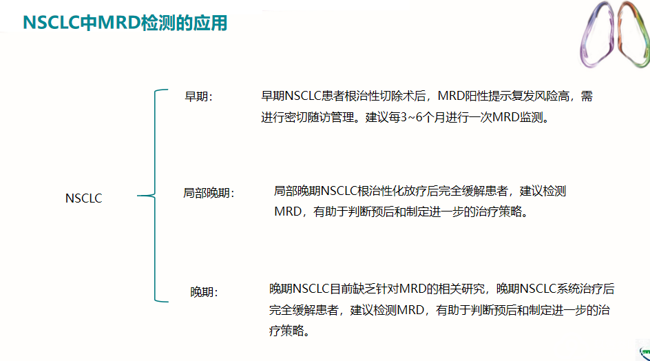 应用范围:MRD是血液肿瘤临床标准实践的一部分。在实体肿瘤(如乳腺癌,肺癌,结直肠癌,前列腺癌等)中使用MRD较新,近年来,在实体肿瘤领域,基于ctDNA指导的MRD(微小/可测量残留病灶)评估,优于传统的临床或影像学方法鉴定出有MRD的患者,并在预测疾病复发风险等方面具有较高的灵敏度和特异性。