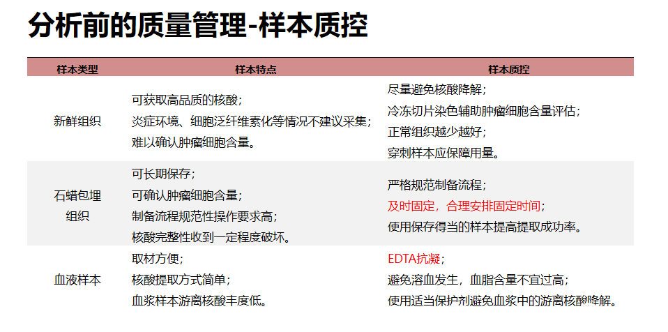 从临床医生开单到实施检测,环节最复杂,参与人员结构最多,需严格执行规范化程序。不同样本来源的核酸均要考察其稳定性、纯度、结构的完整性等参数。应遵循相关指南要求并结合实际情况,确保用于检测的核酸样本满足质量控制要求。
