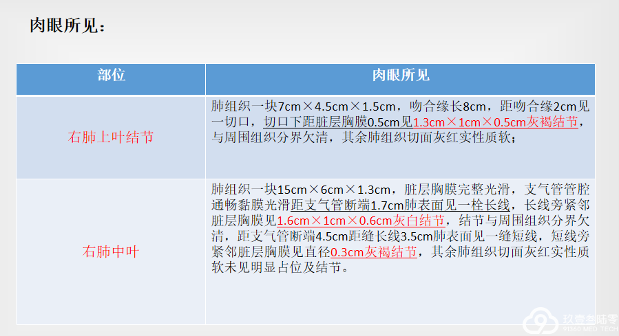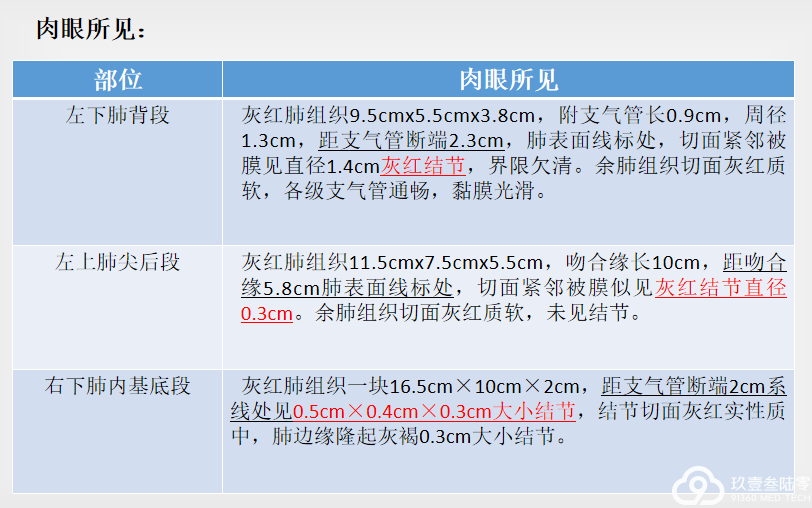 2、双肺散在结节:炎性?肿瘤?肉眼所见:“右肺上叶”灰红肺组织一叶12.5cmx9.5cmx3.2cm,支气管断端长1.5cm,周径1.8cm,距支气管断端3.5cm、4.5cm、5.3cm肺表面分别见3处缝线标记,该处各扪及结节、结节直径约0.3cm-1.1cm,结节均紧邻肺膜;余肺组织多切面未见确切异常。