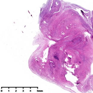 大体:肿瘤常单发,累及髓质和或皮质。通常没有包膜,边界较清。平均9cm。通常囊性成分占主导地位。实性区域灰白实性质地较韧,通常比囊性肾瘤更广泛(根据定义,囊性成分主要由囊肿组成,由纤维间质间隔)